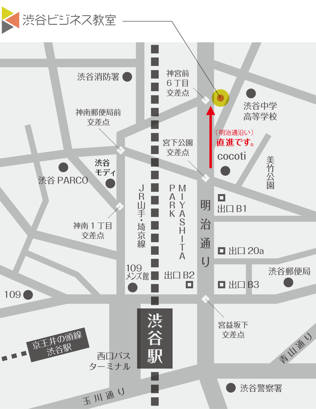 渋谷駅から徒歩5分。明治通り沿いの分かりやすい場所です。 JR山手線、東京メトロ各線「渋谷駅」より徒歩5分。渋谷駅地下道【出口B1】からは明治通り沿いに原宿方面に徒歩1分。神宮前6丁目交差点の横にある「宮下パークビル」702号室です。 (茶色い越一ビルの隣です。)〒150-0001 東京都渋谷区神宮前6-19-16-702